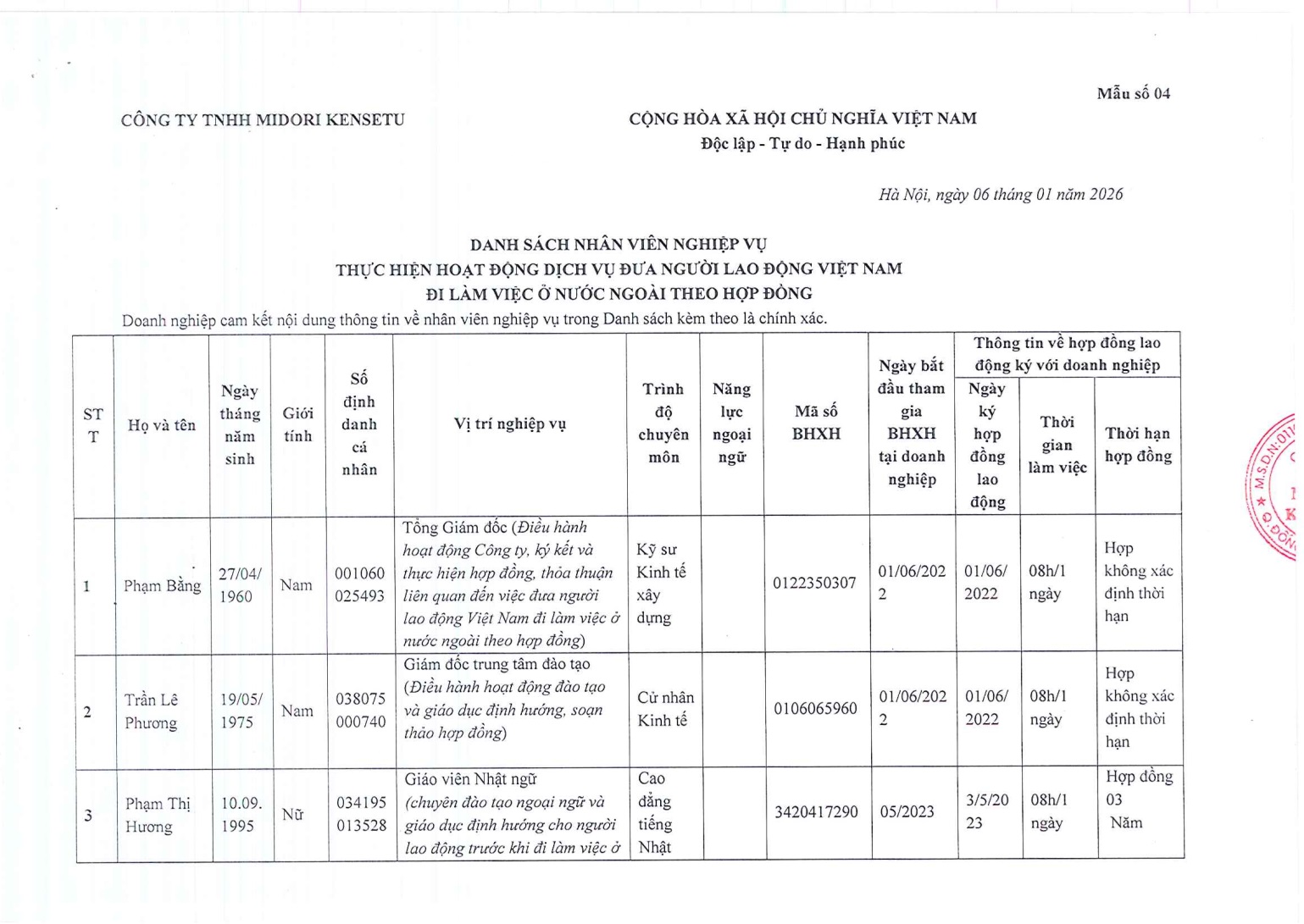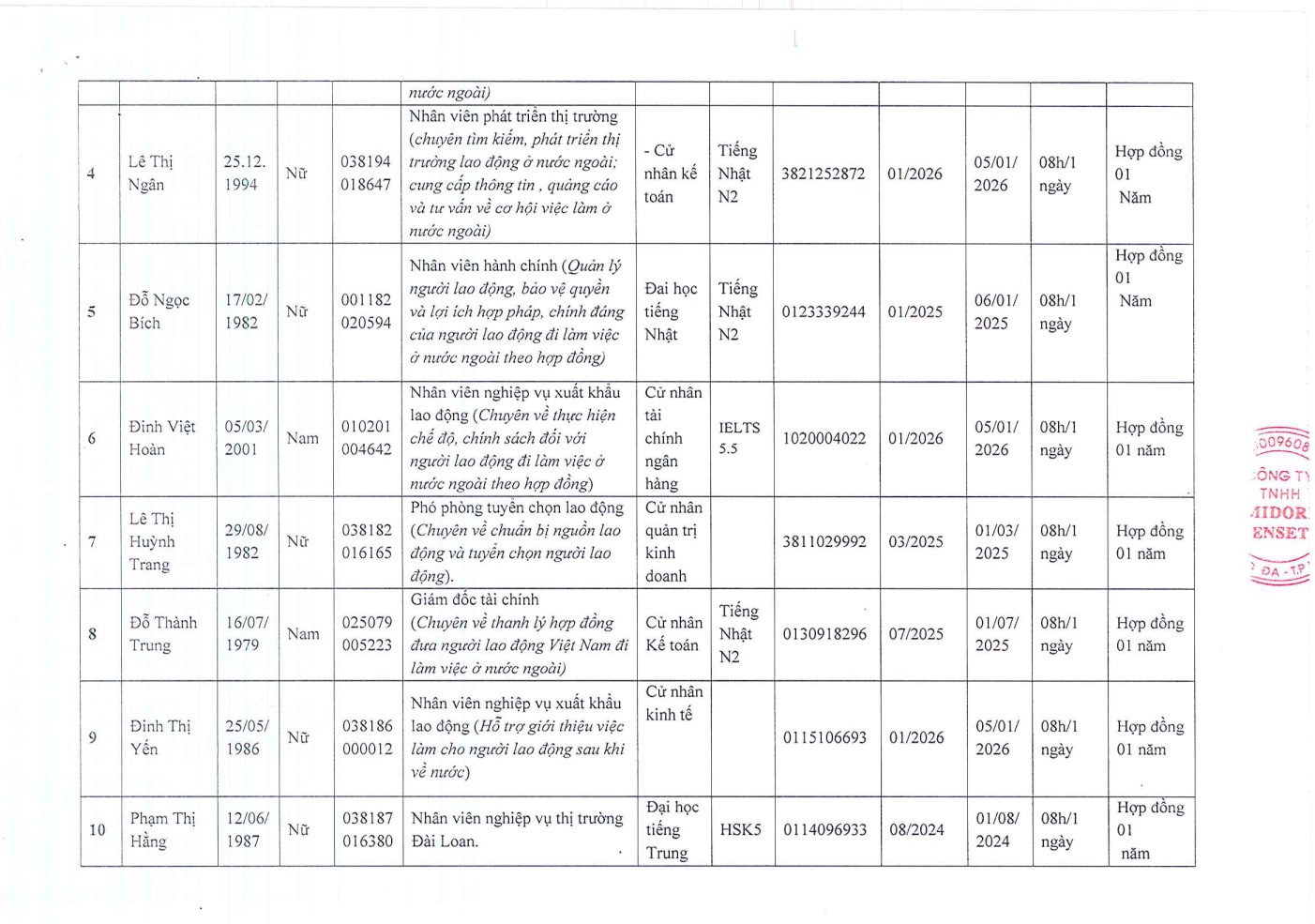 8. DANH SÁCH NHÂN VIÊN NGHIỆP VỤ THỰC HIỆN HOẠT ĐỘNG DỊCH VỤ ĐƯA NGƯỜI LAO ĐỘNG VIỆT NAM ĐI LÀM VIỆC Ở NƯỚC NGOÀI THEO HỢP ĐỒNG TỪ NGÀY 06 THÁNG 01 NĂM 2026